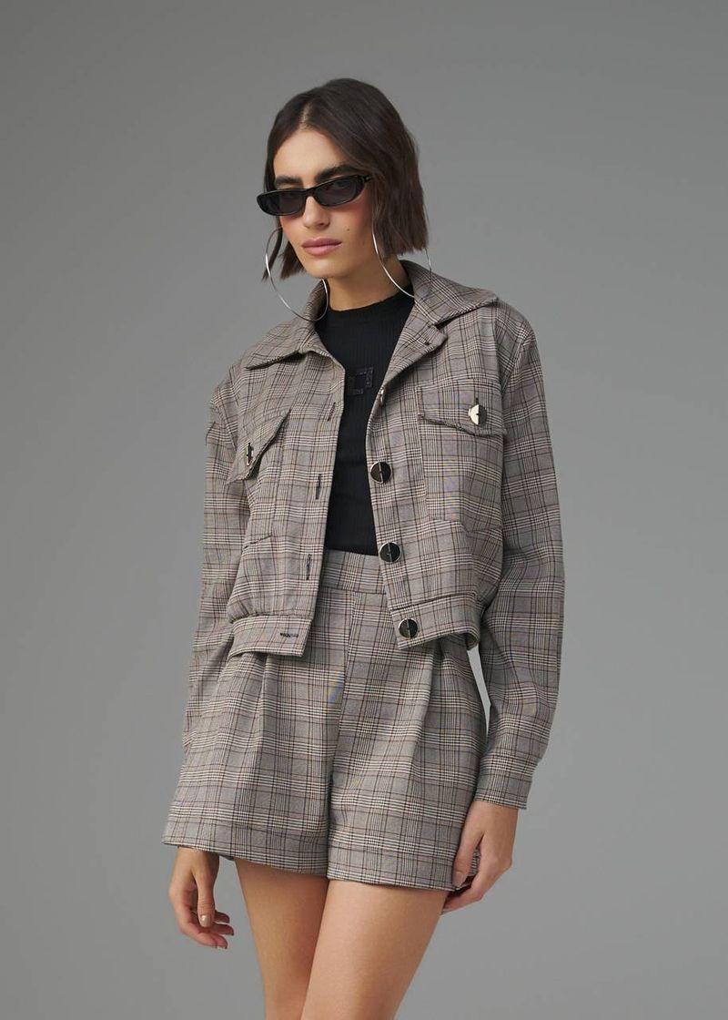 Conjunto Casaco Bolsos Short Xadrez Gales - Camel