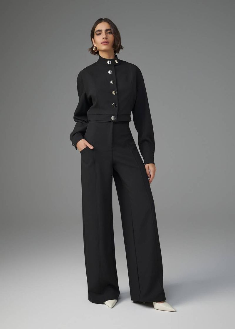 Clássico e atemporal, este conjunto de alfaiataria traduz sofisticação em cada detalhe. O casaco, com gola bem estruturada e recortes estratégicos, traz um caimento impecável e um toque refinado com os botões de metal. A calça, com cós estruturado e bolsos laterais, modela a silhueta com fluidez e precisão. O fechamento por botão de metal e zíper garante um ajuste perfeito, enquanto a bainha de 4cm finaliza o modelo com sofisticação. Na cor preta, o conjunto se torna um ícone de versatilidade e elegância, ideal para produções imponentes e sofisticadas.