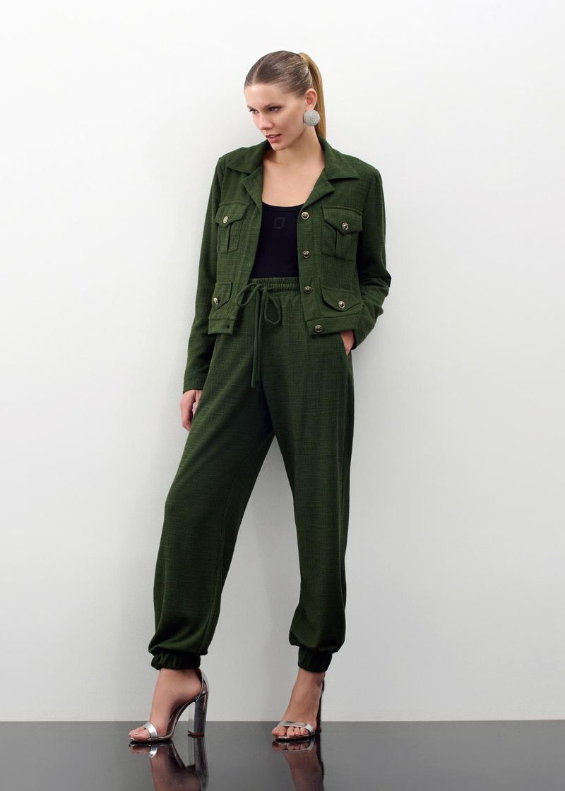 Texturas sofisticadas e modelagem impecável fazem desse conjunto uma opção versátil e cheia de estilo. O casaco estruturado conta com bolsos decorativos e botões de metal personalizados, trazendo um toque de modernidade. A calça jogger, por sua vez, equilibra conforto e elegância com seu caimento fluido e ajuste perfeito. A tonalidade oliva adiciona um ar refinado e contemporâneo, ideal para produções descontraídas. Combine com botas de cano curto e uma bolsa tiracolo para um visual casual chic.