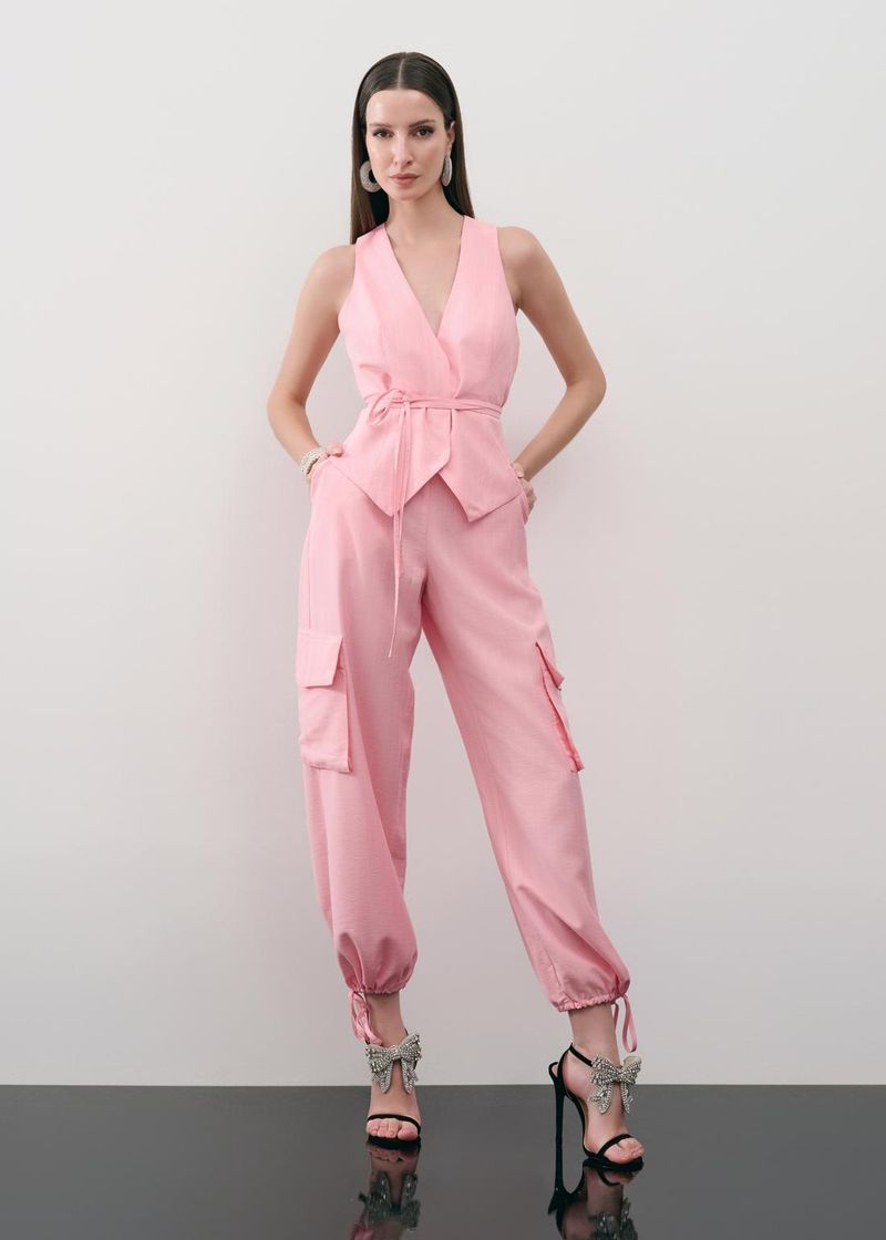 Tons suaves como o baby pink transformam este conjunto em alfaiataria risca de giz mescla em uma escolha cheia de charme e sofisticação. O colete, com abotoamento embutido e faixas ajustáveis, cria uma silhueta elegante, enquanto a calça jogging, com bolsos faca e laterais com tampa, equilibra estilo e funcionalidade. O zíper invisível e as barras ajustáveis adicionam praticidade ao look. Combine com sandálias neutras e acessórios delicados para um visual moderno e feminino.