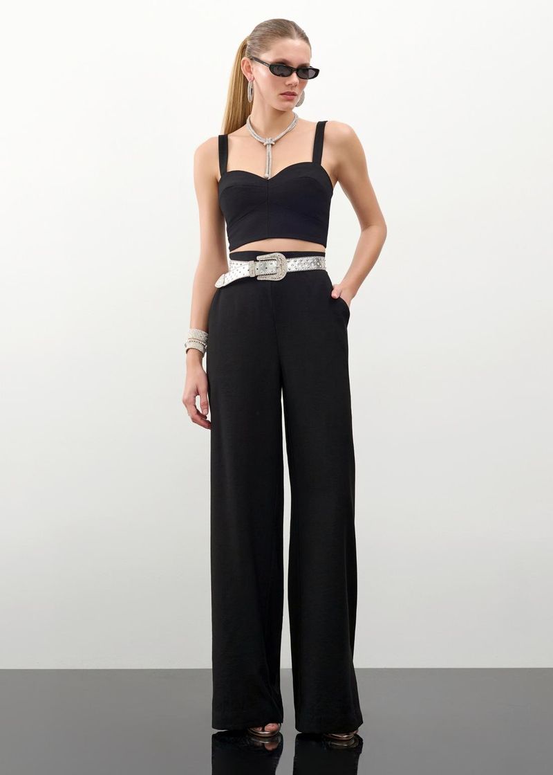 Conjunto Cropped E Calça Wide Leg Essencials - Preto