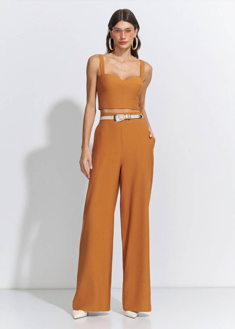 Combinando conforto e classe, este conjunto em alfaiataria na cor camel oferece versatilidade para diversas ocasiões. O top, com seus recortes precisos e alças finas, valoriza suavemente o colo e as costas, garantindo firmeza com o fechamento posterior em zíper destacável. A calça ampla, com pences e zíper invisível nas costas, proporciona fluidez e elegância. Aposte em saltos altos e acessórios minimalistas para um look chique e atemporal. Ideal para reuniões e eventos sociais.