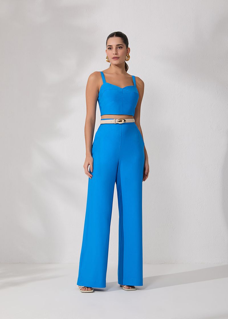 Este conjunto em tecido de alfaiataria é composto por um top cropped elegante, com alças delicadas e recortes estratégicos no busto. Na cor Real Blue, a peça possui fechamento traseiro com elásticos e zíper de metal. A calça wide leg completa o conjunto, apresentando bolsos faca funcionais e pences que valorizam a silhueta. Com fechamento por zíper na parte traseira, proporciona um visual moderno e impecável. Ideal para ocasiões que demandam estilo e conforto, pode ser combinado com tênis branco para uma vibe descontraída ou salto alto para uma composição mais formal.