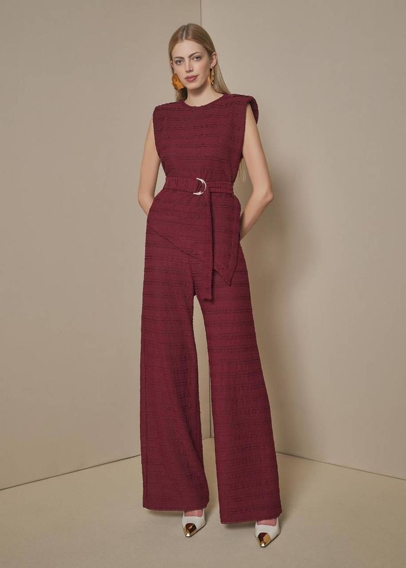 O conjunto em Bordo une presença e sofisticação em cada detalhe. A blusa com ombreiras cria uma linha de postura impecável, enquanto a fenda lateral esquerda acrescenta movimento e um toque de sensualidade elegante. O cinto com fivela de metal meia argola dupla marca a cintura com personalidade, trazendo o equilíbrio perfeito entre força e feminilidade. A calça com pence traseira e zíper invisível completa o visual com caimento preciso. Um look contemporâneo, marcante e ideal para quem busca impacto sem exageros.
