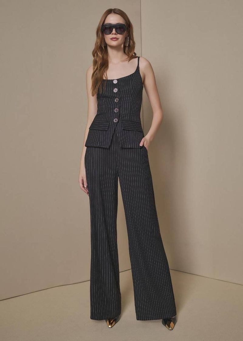 O conjunto Preto é a expressão máxima do poder e da sofisticação. A blusa com recortes e botões metálicos combina estrutura e modernidade, enquanto a calça wide leg adiciona movimento e imponência ao visual. Um look clássico e atemporal, perfeito para quem busca elegância com personalidade e presença marcante.