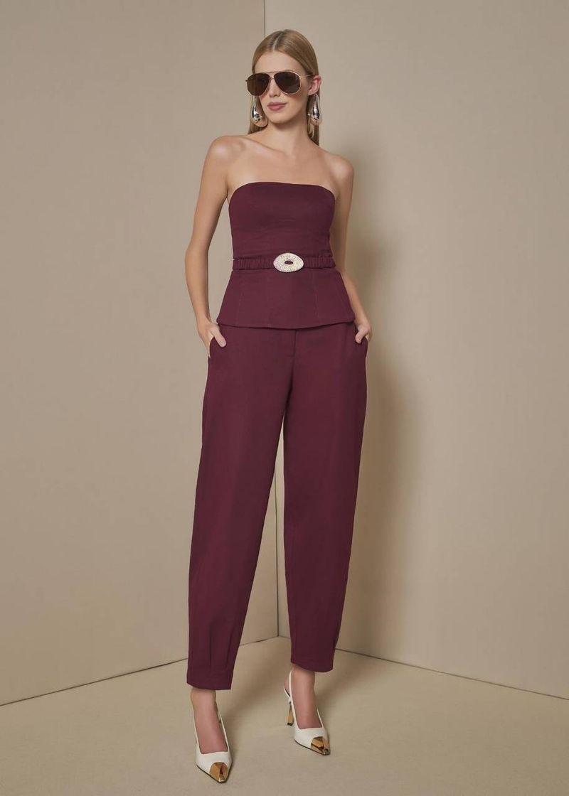 O conjunto Vignon é sinônimo de luxo discreto. O top com barbatanas e fivela de metal irregular cria uma composição moderna e poderosa, enquanto a calça barril, com seu caimento impecável, traduz elegância contemporânea. O tom Vignon, sofisticado e aveludado, traz um toque de mistério e refinamento, perfeito para quem busca um visual elegante, atual e irresistivelmente feminino.