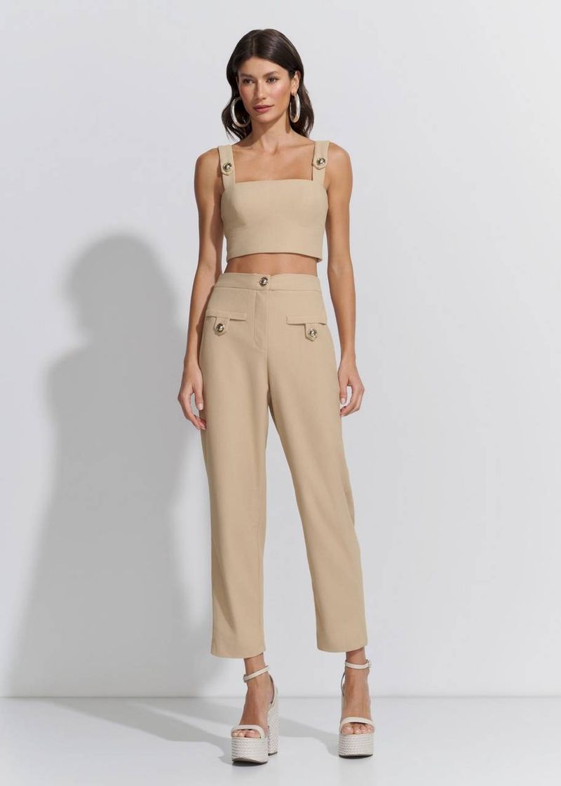 O conjunto em areia traz leveza e elegância para dias em que o visual precisa impressionar com naturalidade. O top estruturado com alças abotoadas e recortes valoriza o busto e cria um caimento impecável, enquanto a calça cenoura com lapelas e detalhes de alfaiataria entrega um toque de sofisticação. Ideal para eventos ao ar livre, exposições ou um brunch especial. Combine com sandálias de tiras finas e acessórios dourados.