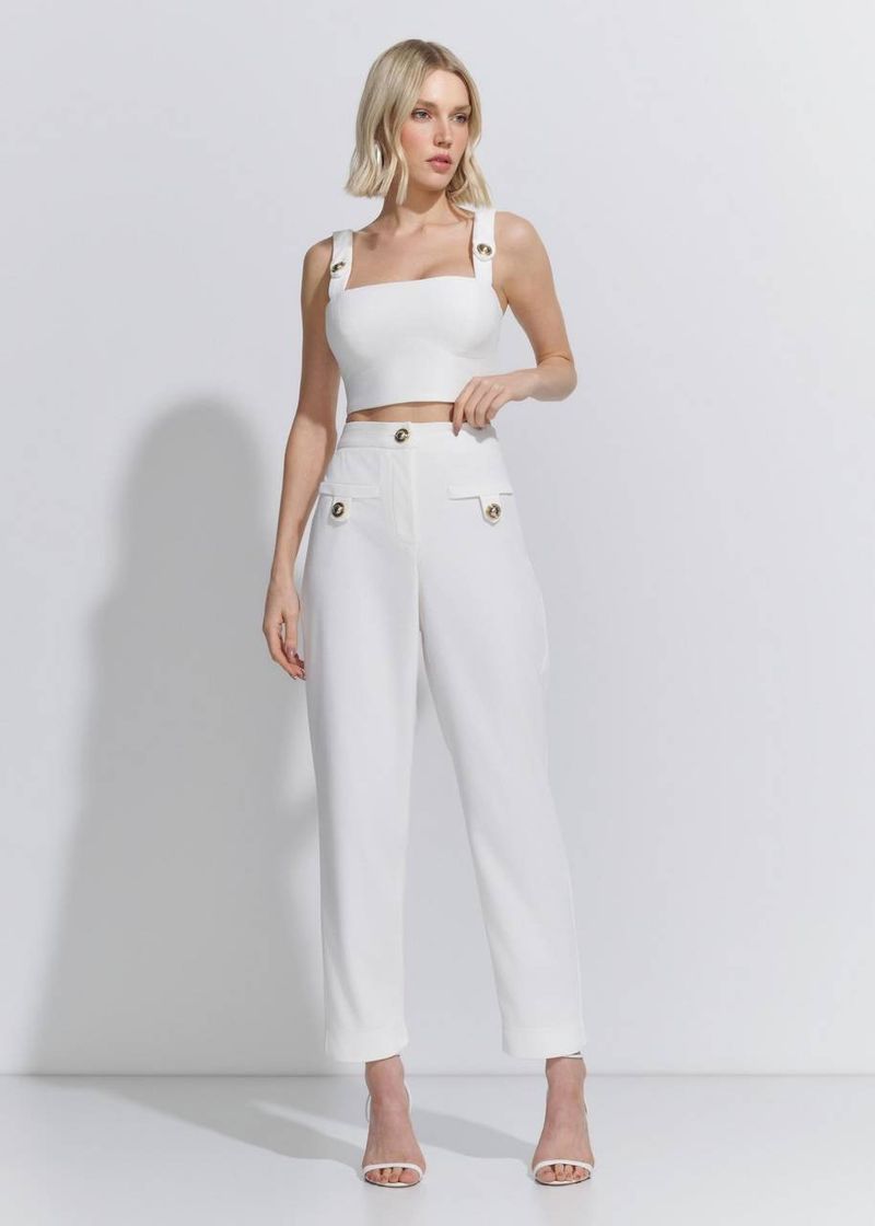 Sofisticado e versátil, o conjunto off-white em tecido texturizado é perfeito para quem deseja elegância com um toque contemporâneo. O top com recortes e acabamento impecável cria contraste com a calça cenoura de cintura alta, estruturada e moderna. Ideal para produções de verão com styling refinado. Use com salto bloco, brincos perolados e clutch minimalista para ocasiões como jantares ou festas em ambientes abertos.