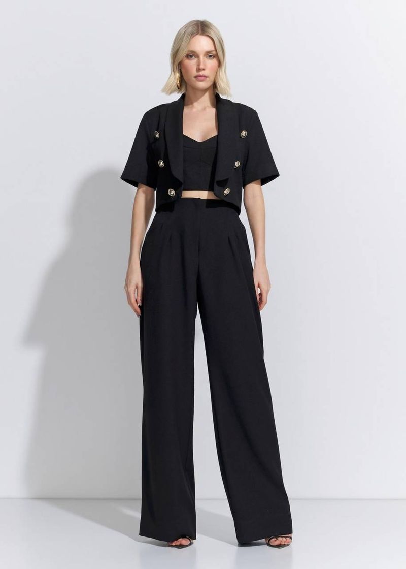 Imponente e versátil, o conjunto preto entrega presença absoluta com sofisticação. O top estruturado com zíper metálico contrasta com o shape fluido da calça de alfaiataria, enquanto o casaqueto com botões dourados adiciona imponência ao look. Ideal para eventos noturnos, coquetéis e ocasiões formais. Finalize com salto alto, brincos statement e uma clutch envelope em couro com textura croco para um visual de impacto.