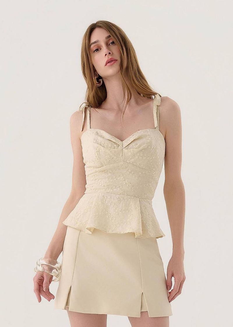 O corselet bordado na cor areia traduz leveza e sofisticação em uma tonalidade neutra e versátil. As pregas no busto conferem movimento delicado, enquanto o peplum estruturado valoriza a silhueta com feminilidade. O bordado sutil enriquece o design, criando um efeito atemporal. Combine com calças em tons claros ou saias fluidas para produções que equilibram frescor e elegância em qualquer ocasião.