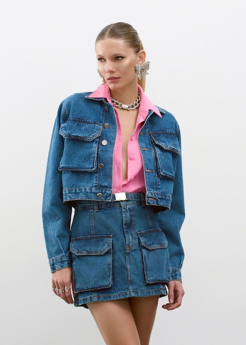 Jaqueta Jeans Cropped Cargo - Jeans
