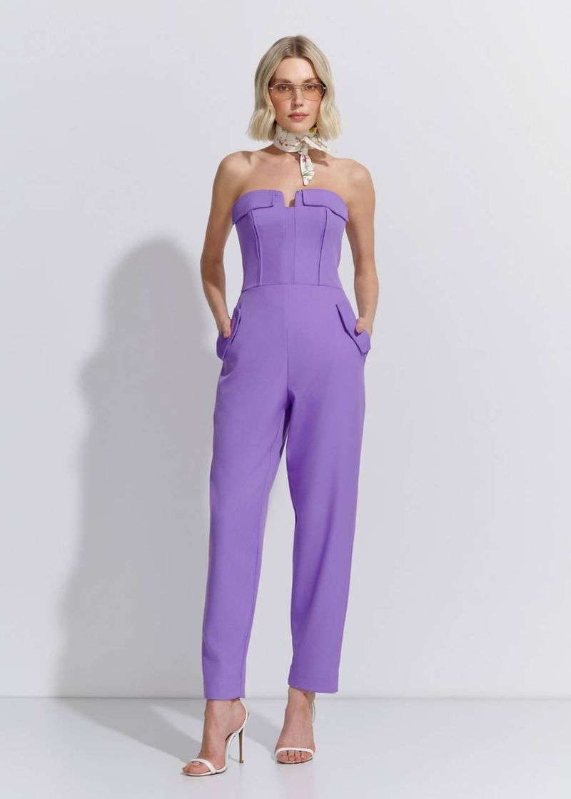 Com um tom vibrante e feminino, o macacão lilás traz um visual moderno e marcante. O decote com aplicações estruturadas e recortes com detalhe vazado valorizam o busto com sutileza. O caimento ajustado ao corpo e os bolsos com lapelas adicionam um toque de alfaiataria contemporânea. Ideal para produções sofisticadas e ousadas com sandálias de salto e acessórios metalizados.