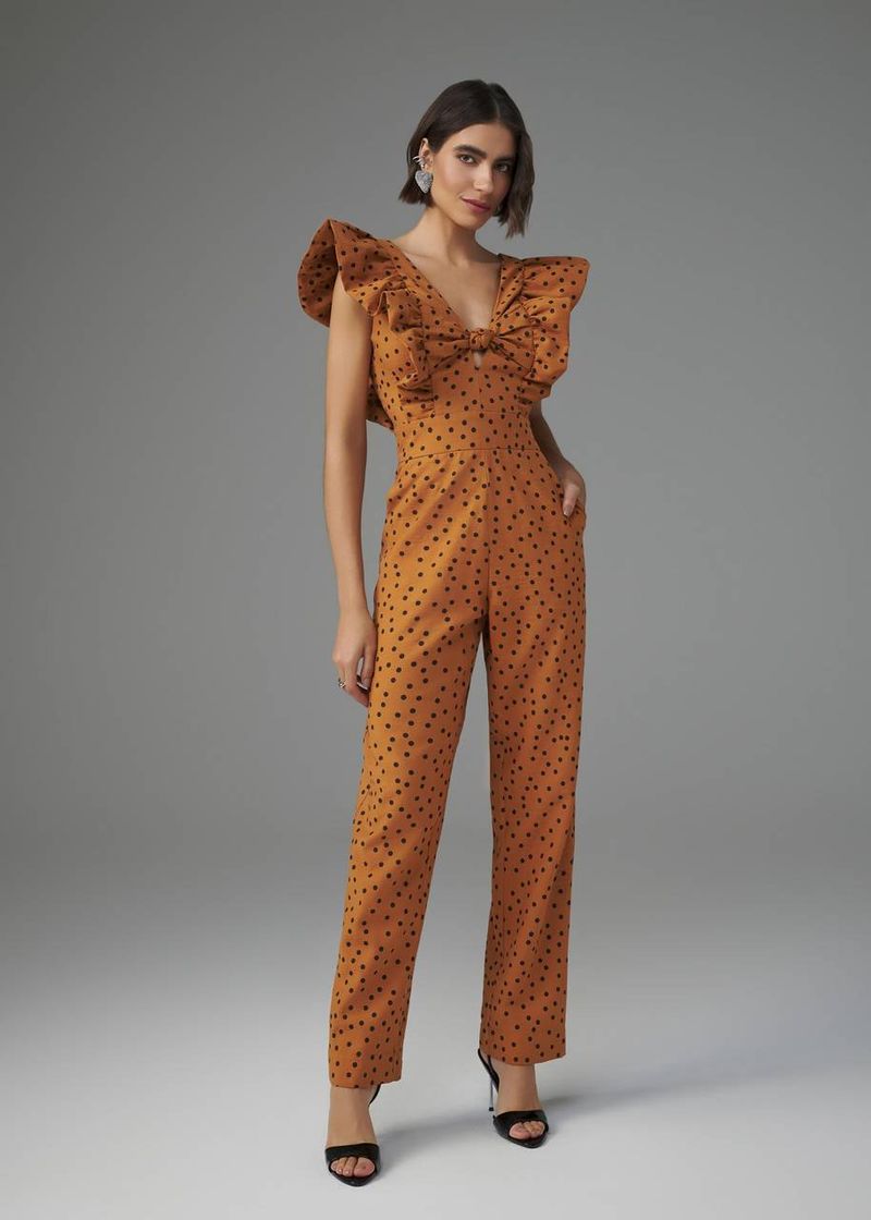 SaleMacacãoMacacão Decote Nó Babados Estampa Poá - Camel