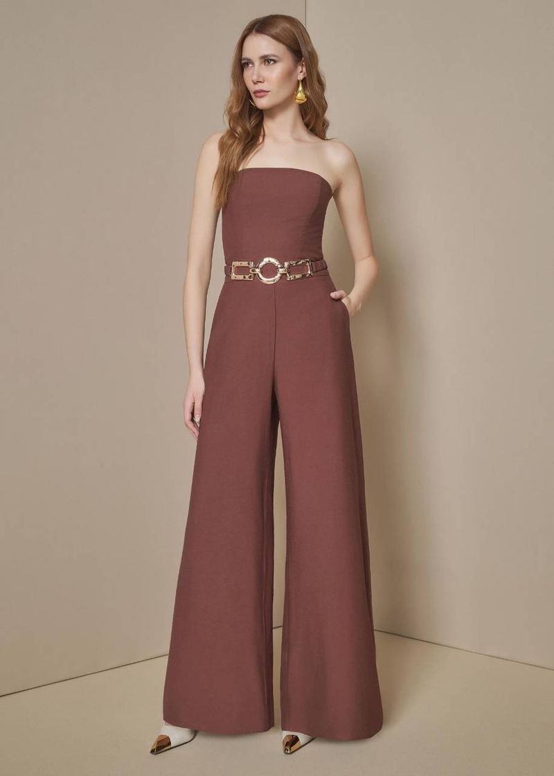 O macacão tomara que caia em Choco traduz a elegância contemporânea em sua versão mais sofisticada. Os recortes estruturados com barbatanas valorizam o busto e criam um desenho impecável no tronco, enquanto o tom terroso profundo traz modernidade e presença. O cinto com fivela de argolas em metal dá o toque final de força urbana, criando contraste perfeito com a fluidez da peça. Versátil e marcante, acompanha você do jantar ao evento noturno com naturalidade.