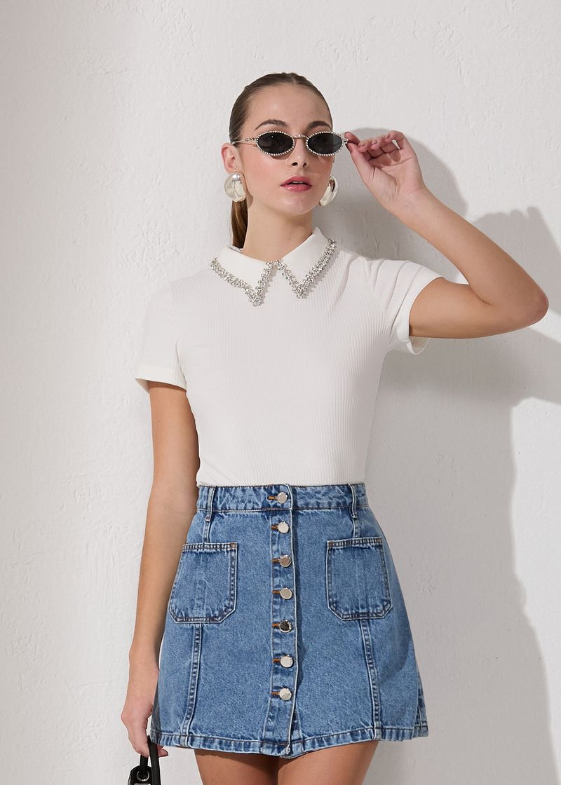 Saia jeans curta com bolsos frontais, feita em tecido 100% algodão proporcionando conforto e durabilidade. Esta peça une estilo casual com praticidade, sendo um item essencial em seu closet, adaptando-se facilmente a diferentes estilos e estações do ano. Experimente combiná-la com uma camiseta básica e tênis para um look descontraído no dia a dia, ou opte por uma blusa mais elegante e sandálias para um visual mais sofisticado.