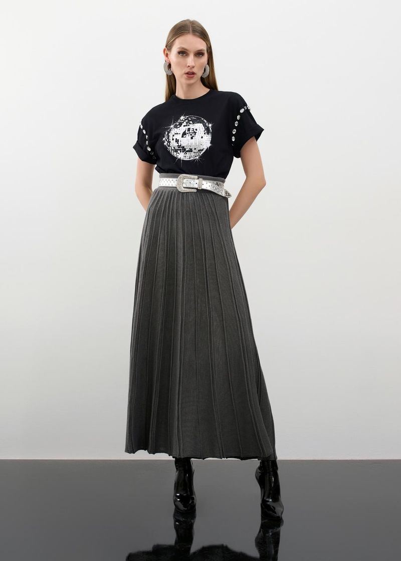 Moderna e sofisticada, a saia maxi mídi em tricot chumbo combina fluidez e elegância para um visual contemporâneo. A modelagem evasê alonga a silhueta, enquanto os detalhes em nervuras criam um efeito texturizado que valoriza o movimento da peça. No tom chumbo, ela ganha um toque urbano e versátil, perfeito para composições refinadas. Aposte em uma blusa de gola alta e botas de couro para um look elegante nos dias mais frios ou combine com um body estruturado e sandálias de salto para um toque sofisticado em eventos noturnos.