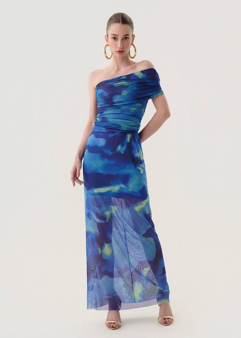 Saia midi estampada em tons Blue Match, com caimento leve e cintura em elástico que garante conforto e praticidade. O design alongado valoriza a silhueta, enquanto a estampa vibrante transmite frescor e modernidade. Ideal para composições elegantes de verão, pode ser combinada com tops neutros ou peças na mesma cartela de cores para um visual sofisticado.