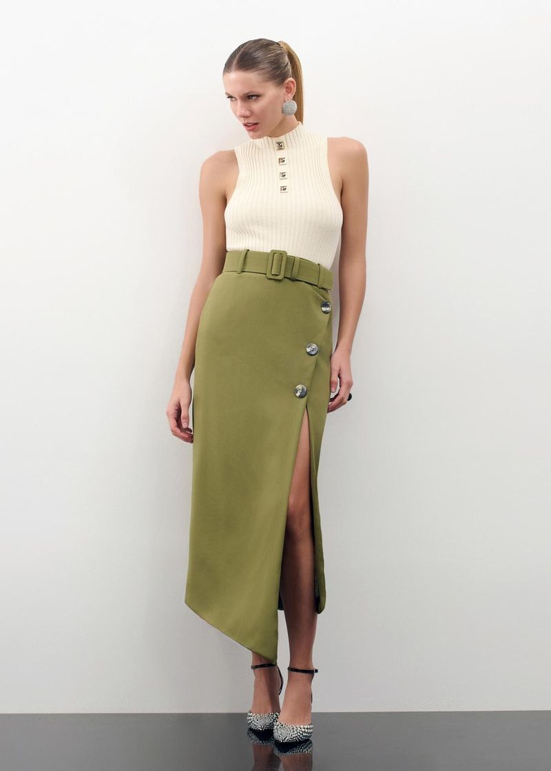 Linhas precisas e acabamento impecável fazem dessa saia uma escolha sofisticada para qualquer ocasião. O design estruturado, aliado à fluidez do trêspasse, equilibra formalidade e modernidade na medida certa. O tom oliva adiciona uma sofisticação discreta, sendo perfeito para looks contemporâneos. Para um visual refinado, combine-a com um blazer off-white e sandálias de salto bloco. Já para um toque urbano e despojado, uma blusa cropped e tênis branco criam um contraste fashionista e moderno.