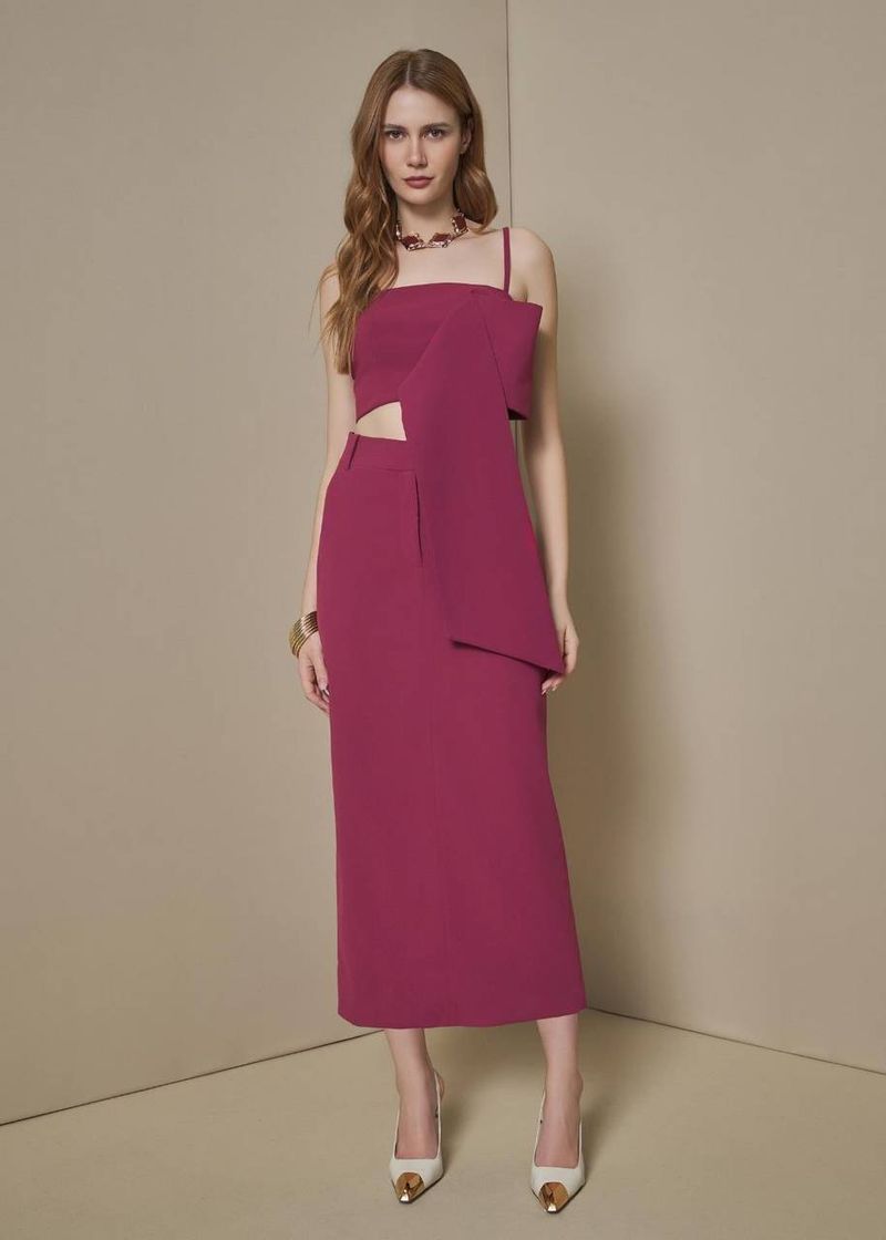 A saia midi em Bordo combina força e sofisticação em uma peça que valoriza a silhueta com maestria. O fechamento frontal com colchetes de metal adiciona um toque moderno, enquanto a modelagem estruturada com pences nas costas cria um caimento impecável. A fenda traseira traz movimento e sensualidade na medida certa. Em Bordo, a saia ganha profundidade e presença, perfeita para composições elegantes que se destacam sem esforço.