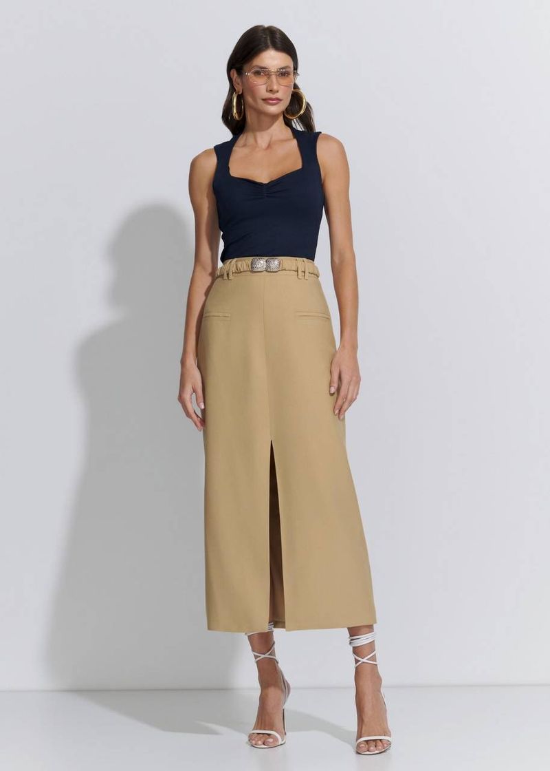 Saia Mídi Fenda Cinto Visco Metal - Areia
