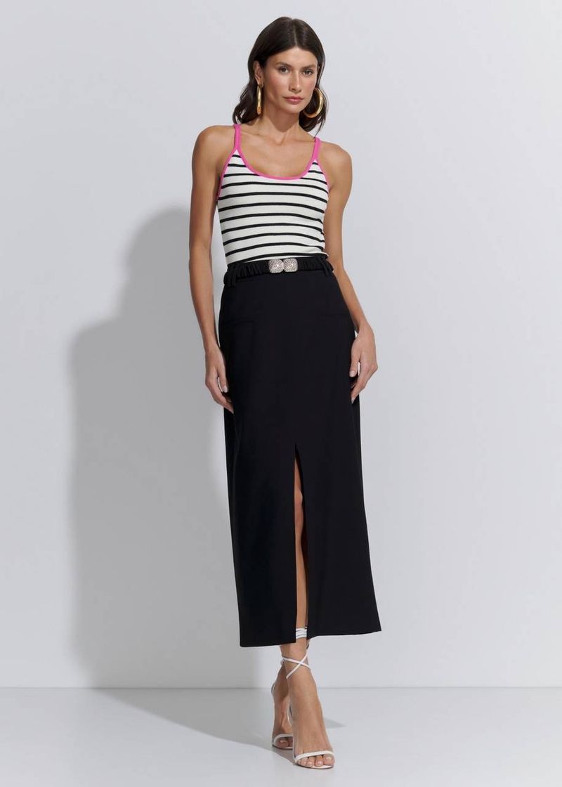 Elegante e atemporal, a saia preta em alfaiataria é um clássico indispensável no guarda-roupa feminino. A fenda frontal garante movimento e sensualidade sutil, enquanto o cinto com fivela traz acabamento sofisticado. Ideal para jantares, ambientes corporativos ou eventos noturnos. Use com regata de tricot, salto alto e uma bolsa carteira com design geométrico para um toque contemporâneo e imponente.