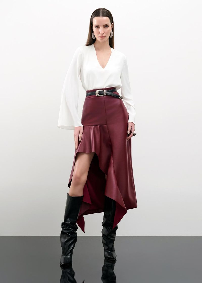 Estruturada e elegante, essa saia mídi em malha encorpada é a combinação perfeita de conforto e estilo. O detalhe de jabot na frente cria movimento e valoriza a silhueta, enquanto os recortes estratégicos ajustam-se ao corpo com delicadeza. O zíper invisível nas costas garante um acabamento impecável. No tom cherry, a peça ganha destaque, ideal para jantares ou eventos noturnos. Use com blusas ajustadas e salto fino para um look sofisticado.
