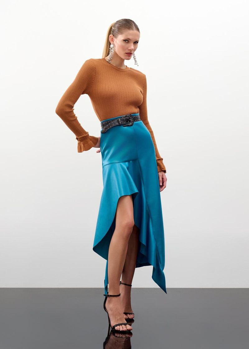 Cheia de personalidade, essa saia mídi em malha encorpada é marcada pelo jabot na frente, que adiciona movimento ao design. Os recortes valorizam a silhueta, garantindo conforto e elegância. Em laguna blue, a peça se torna leve e moderna, perfeita para eventos casuais. Combine com sandálias de salto bloco para um visual despojado e chic.