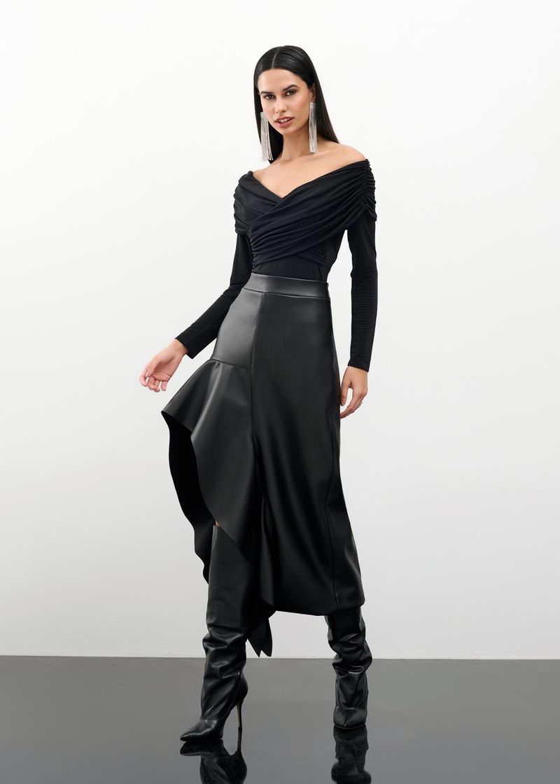 Atemporal e cheia de estilo, essa saia mídi preta em malha encorpada é um coringa para produções elegantes. O jabot frontal acrescenta charme e movimento, enquanto os recortes valorizam a silhueta. O zíper invisível nas costas oferece um acabamento impecável. Combine com blusas de alfaiataria e salto fino para um look sofisticado e marcante.