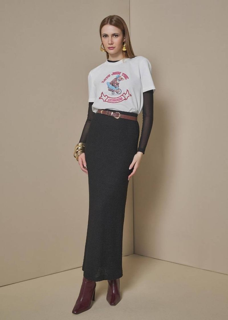 A versão em Preto é o clássico indispensável do guarda-roupa. O cós elástico torna a peça extremamente confortável sem perder o caimento impecável, enquanto a cor garante versatilidade total. Sofisticada, minimalista e funcional, é a saia que transita facilmente do office chic ao visual noturno com apenas alguns ajustes nos acessórios.