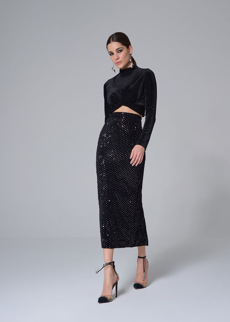 Saia midi reta em veludo sofisticado com bordados de paetês. Esta saia conta com fenda em suas parte traseira, um cós super confortável e fechamento em zíper invisível na parte traseira. Escolha ser deslumbrante, combinando luxo e estilo em suas composições!