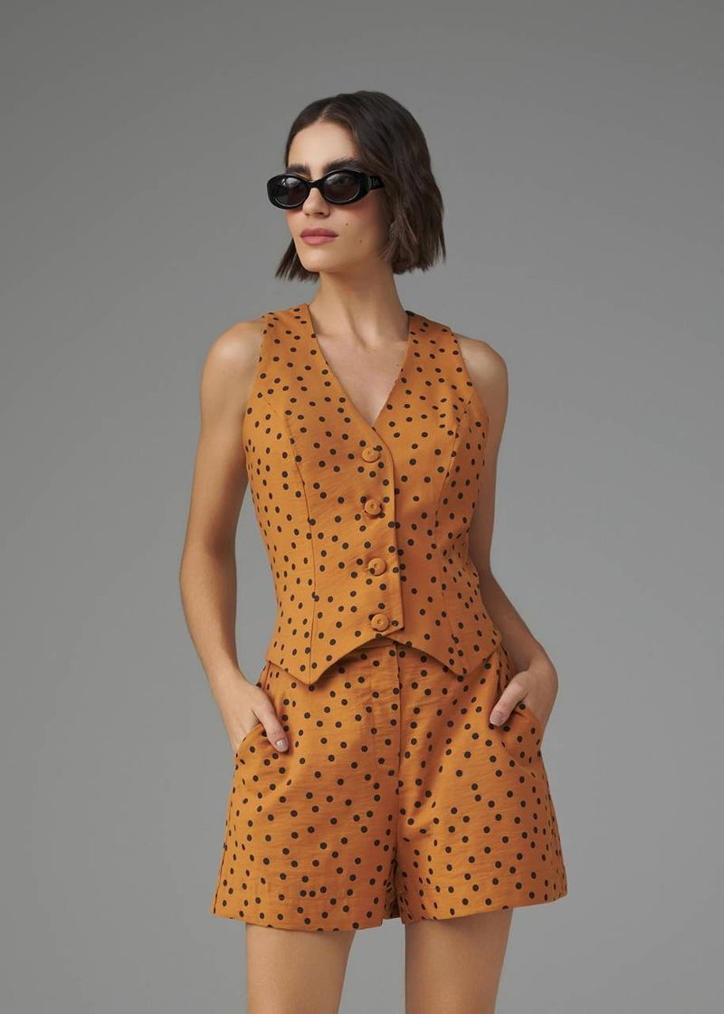 O charme da estampa poá aliado à alfaiataria impecável faz deste short uma peça sofisticada e moderna. O cós trespassado proporciona um ajuste diferenciado, enquanto os passantes permitem diversas possibilidades de combinação. As pences traseiras garantem um caimento alinhado, e o fechamento por zíper e colchetes assegura um acabamento refinado. Em tom camel, a peça ganha um toque clássico e versátil, ideal para composições elegantes e atemporais.