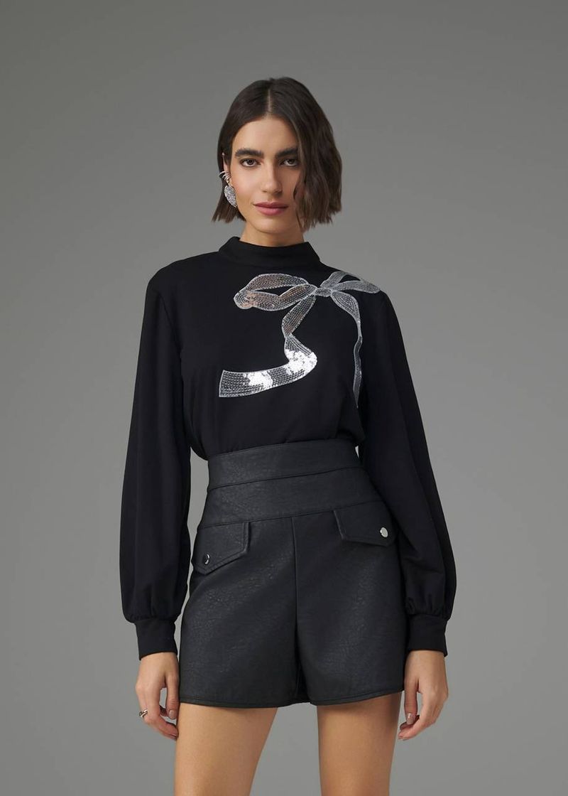 Atemporal e sofisticado, este short em couro sintético estonado destaca-se pelos recortes estruturados e pelo acabamento refinado. O cós ajustado valoriza a silhueta, enquanto os detalhes de tampas frontais e debrum na barra garantem um visual moderno e elegante. O zíper invisível traseiro proporciona um ajuste impecável, e os botões de pressão personalizados adicionam um toque exclusivo ao design. Na cor preta, a peça se torna um clássico indispensável, perfeita para looks sofisticados e impactantes.