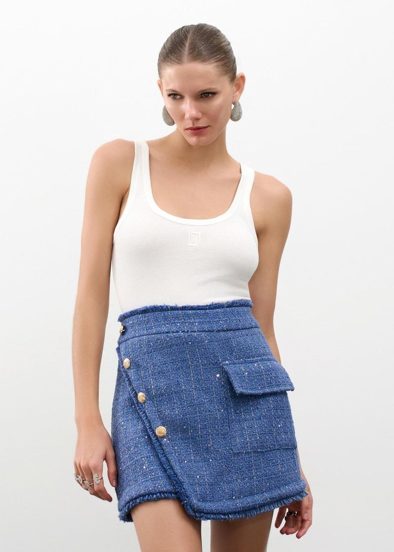 Short Saia Em Tweed Com Botões Golden Tweed - Denim