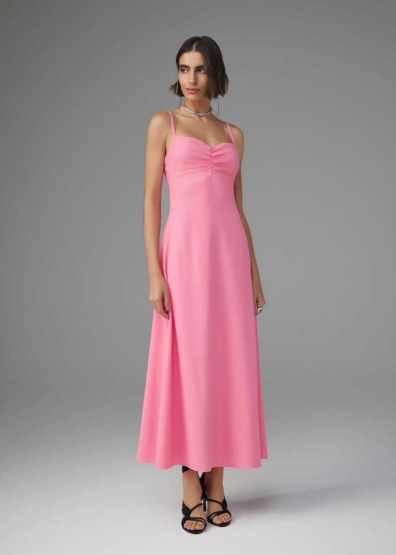 Sofisticação e feminilidade se encontram neste vestido mídi em crepe, que valoriza a silhueta com um caimento fluido e impecável. As alças finas trazem delicadeza ao visual, enquanto o franzido no busto realça a modelagem com um toque refinado. O comprimento mídi adiciona elegância, e o zíper invisível traseiro assegura um fechamento discreto e alinhado. Na tonalidade chicletes, a peça ganha um toque vibrante e contemporâneo, ideal para composições que refletem feminilidade e modernidade.