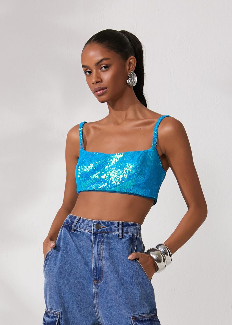 Esse top em paetê azul exala charme e sofisticação. A cor vibrante e a textura brilhante dos paetês trazem um toque moderno ao visual, enquanto as alças finas valorizam o colo com um ar delicado. O zíper de metal nas costas garante um ajuste perfeito e uma silhueta elegante. Combine-o com uma saia lápis preta para criar um contraste sofisticado e use saltos altos para alongar as pernas. Finalize com acessórios discretos, como brincos de pérola e uma clutch minimalista, para um visual glamouroso e refinado, ideal para eventos especiais.