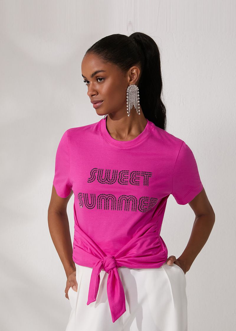 A T-shirt Amarração Sweet Summer na cor pink é perfeita para quem busca estilo e versatilidade. O detalhe de amarração adiciona charme, enquanto as mangas curtas e o decote redondo oferecem conforto para dias quentes. O silk frontal com hot fix confere sofisticação e modernidade. Combine-a com jeans ou shorts para um look casual ou com uma saia midi para um toque mais elegante. Ideal para passeios ou encontros informais, ela garante conforto e estilo em qualquer ocasião.