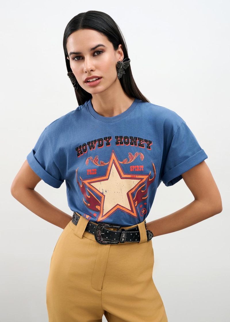 Denim é a escolha perfeita para quem busca um visual despojado com um toque de charme. Esta t-shirt em malha de algodão, com a estampa "Howdy Honey", equilibra conforto e estilo, sendo ideal para composições casuais. Combine com shorts ou saia jeans e finalize com sandálias rasteiras, criando um look fresco e cheio de atitude para os dias mais quentes.