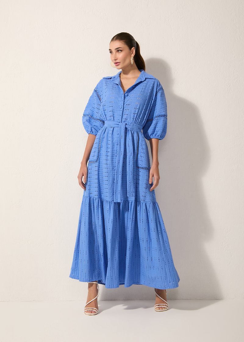 O vestido longo em laise na cor denim é encantador e versátil. Com gola elegante e mangas bufantes românticas, oferece um toque vintage ideal para ocasiões especiais. Os bolsos laterais são práticos e sofisticados, e a faixa para amarração define a cintura com graça. Botões forrados e aviamento vazado adicionam charme artesanal. Combine com sandálias de salto e acessórios sofisticados para eventos formais ou com uma bolsa de mão e sapatilhas para um look casual.