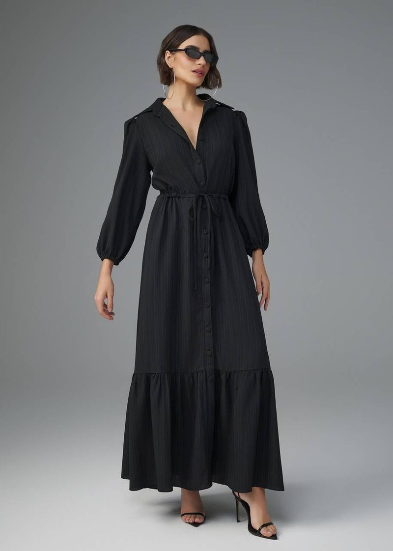 Clássico e sofisticado, este vestido maxi mídi combina a fluidez do crepe texturizado com detalhes que agregam refinamento ao visual. A gola confere um toque elegante, enquanto as mangas bufantes trazem volume e modernidade à peça. O abotoamento frontal e a amarração na cintura garantem um ajuste versátil e estruturado, e o barrado franzido adiciona movimento e charme. Na cor preta, a peça ganha ainda mais imponência e versatilidade, perfeita para composições sofisticadas e atemporais.