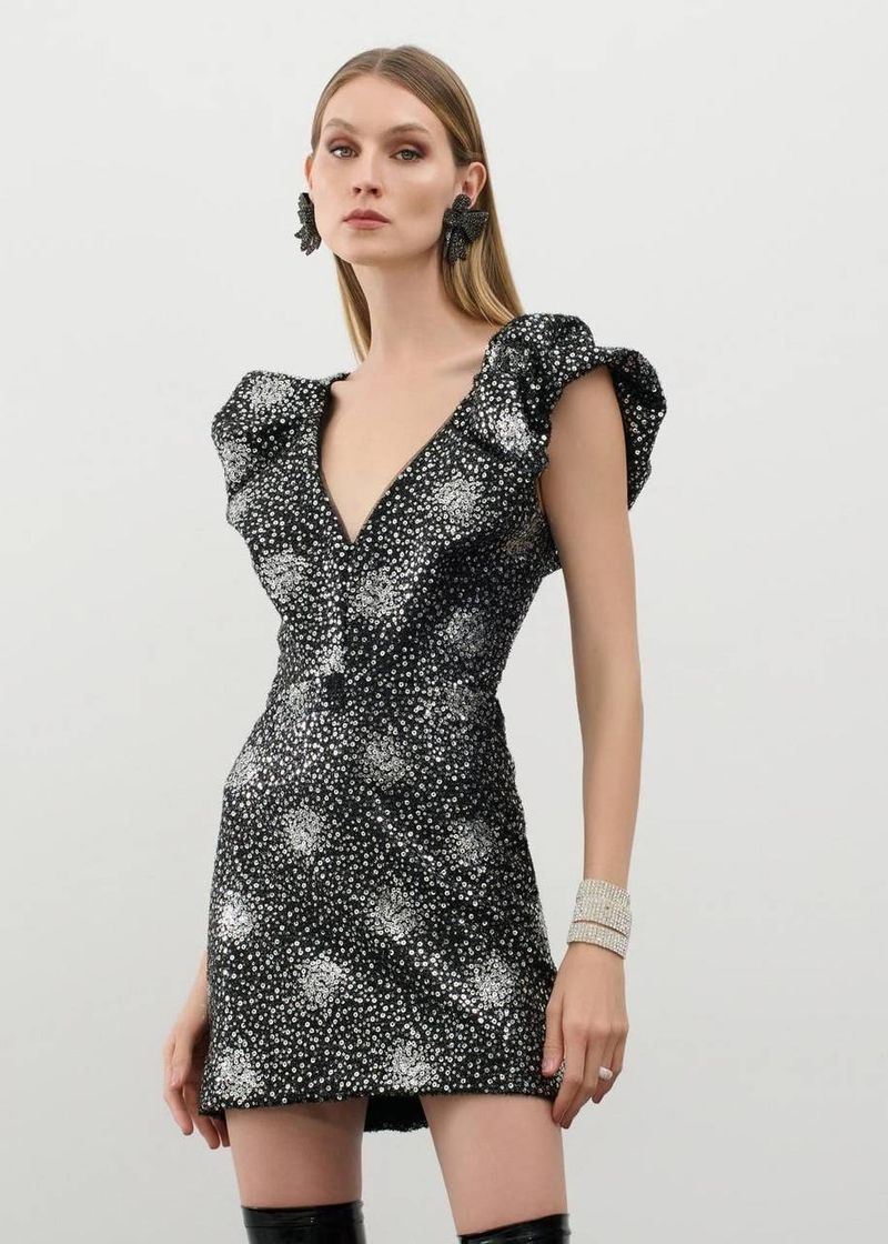 vestido curto alça balonê paetê glamour - prata