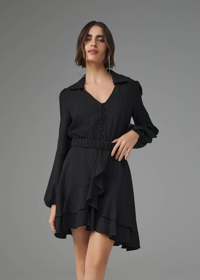 Com um design estruturado e detalhes marcantes, este vestido curto em crepe texturizado combina fluidez e sofisticação. A gola e o jabô reforçam a proposta clássica e refinada, enquanto as mangas bufantes adicionam um toque de romantismo. O abotoamento frontal permite diferentes possibilidades de styling, e a barra com babados complementa a peça com leveza. O zíper invisível traseiro finaliza o modelo com um caimento alinhado. Na cor preta, o vestido ganha um ar de sofisticação imponente, perfeito para visuais elegantes e marcantes.