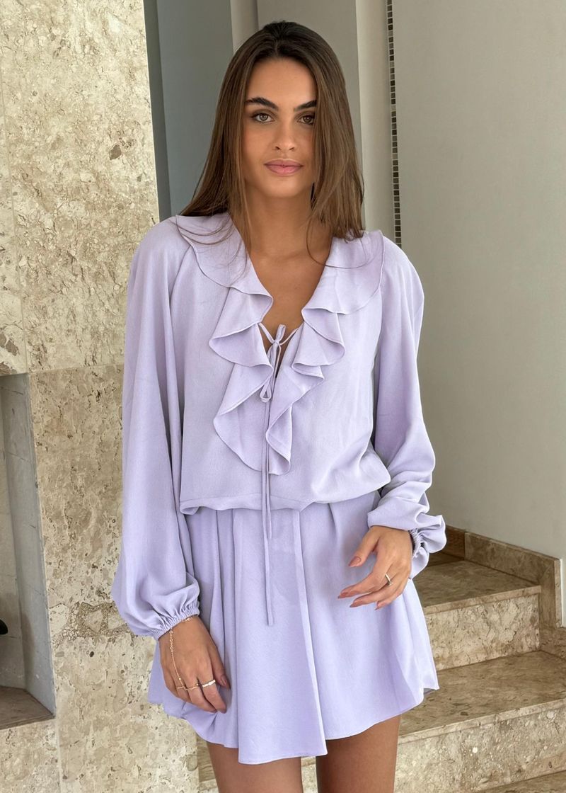 Com design elegante e acabamento delicado, este vestido em crepe oferece movimento e sofisticação em cada detalhe. A manga raglan suaviza a estrutura da peça, conferindo um visual fluido, enquanto o decote com babado e amarração acrescenta um toque de romantismo refinado. Na tonalidade violace, o modelo ganha frescor e originalidade, ideal para quem busca sofisticação com personalidade.