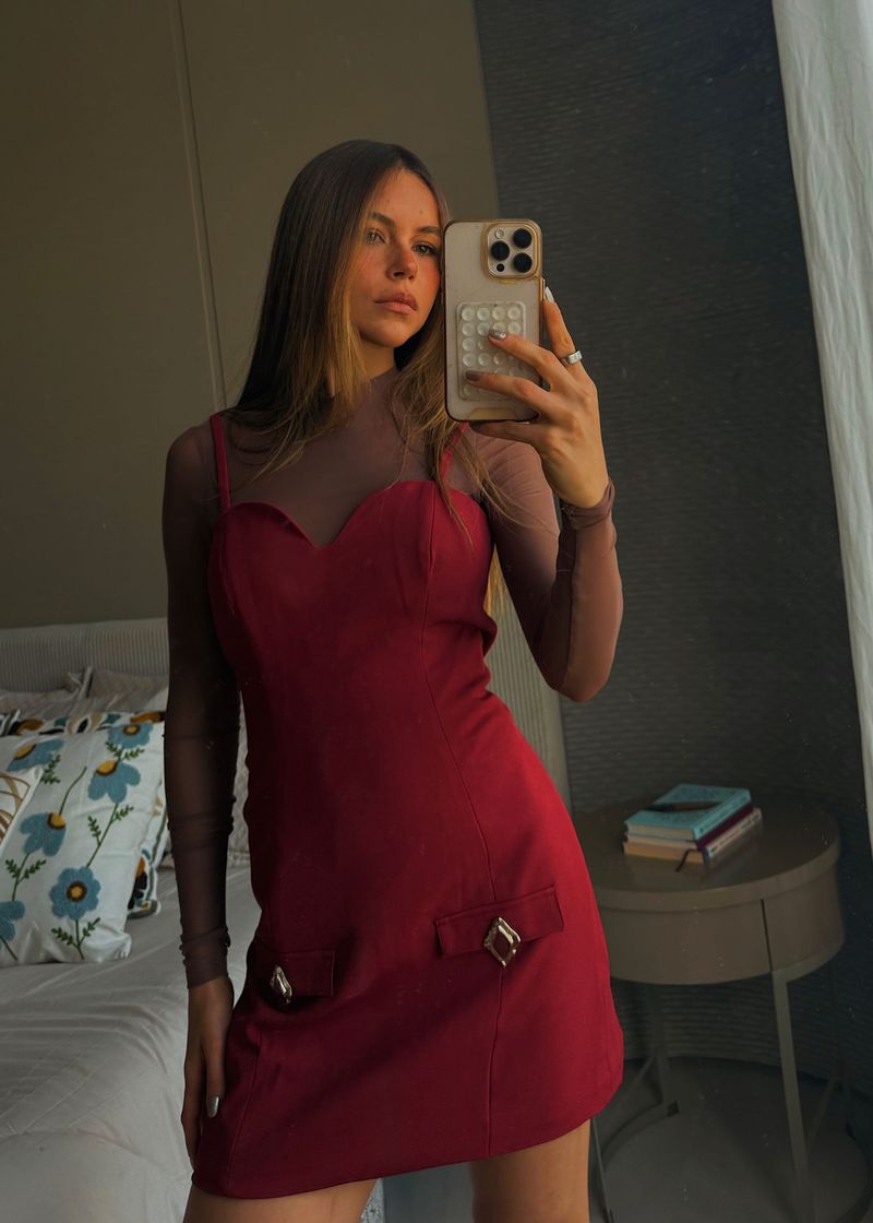 O vestido curto em tom bordô une feminilidade e sofisticação em uma modelagem estruturada e moderna. O decote coração valoriza o colo com delicadeza, enquanto os recortes estratégicos e as barbatanas no busto proporcionam um caimento impecável. As lapelas com botões de metal e resina trazem um toque glamouroso e contemporâneo, perfeito para ocasiões especiais.