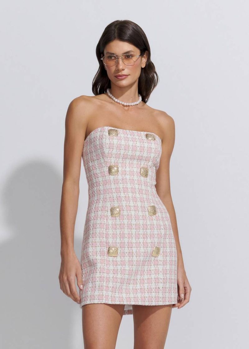 O vestido curto em tweed rosa é a união perfeita entre romantismo e sofisticação. Com modelagem estruturada e sem alças, ele destaca o colo e valoriza a silhueta com recortes estratégicos e botões dourados frontais que evocam um charme retrô. O tecido encorpado traz elegância instantânea, ideal para eventos diurnos ou produções mais fashionistas. Use com scarpin nude ou botas de cano curto para um visual ainda mais marcante.