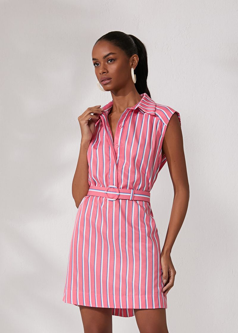 Vestido Curto Cinto Tricoline Lurex Stripe - Coral