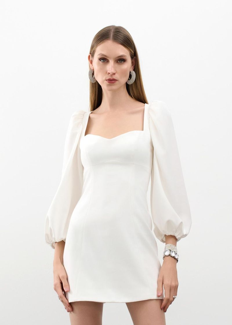 A sofisticação atemporal desse vestido curto em crepe se traduz em detalhes como o decote coração estruturado, que valoriza a silhueta, e os recortes estratégicos, que garantem um ajuste impecável. As mangas bufantes conferem um toque de romantismo e movimento, deixando a peça ainda mais delicada. No tom off-white, ele se torna sinônimo de elegância e versatilidade, ideal para celebrações especiais e ocasiões que pedem um visual refinado. Combine com salto nude e clutch perolada para um look sofisticado e impecável.