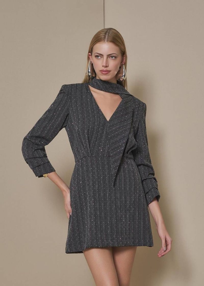 Vestido Curto De Gola Amarrado Em Alfaiataria - Preto