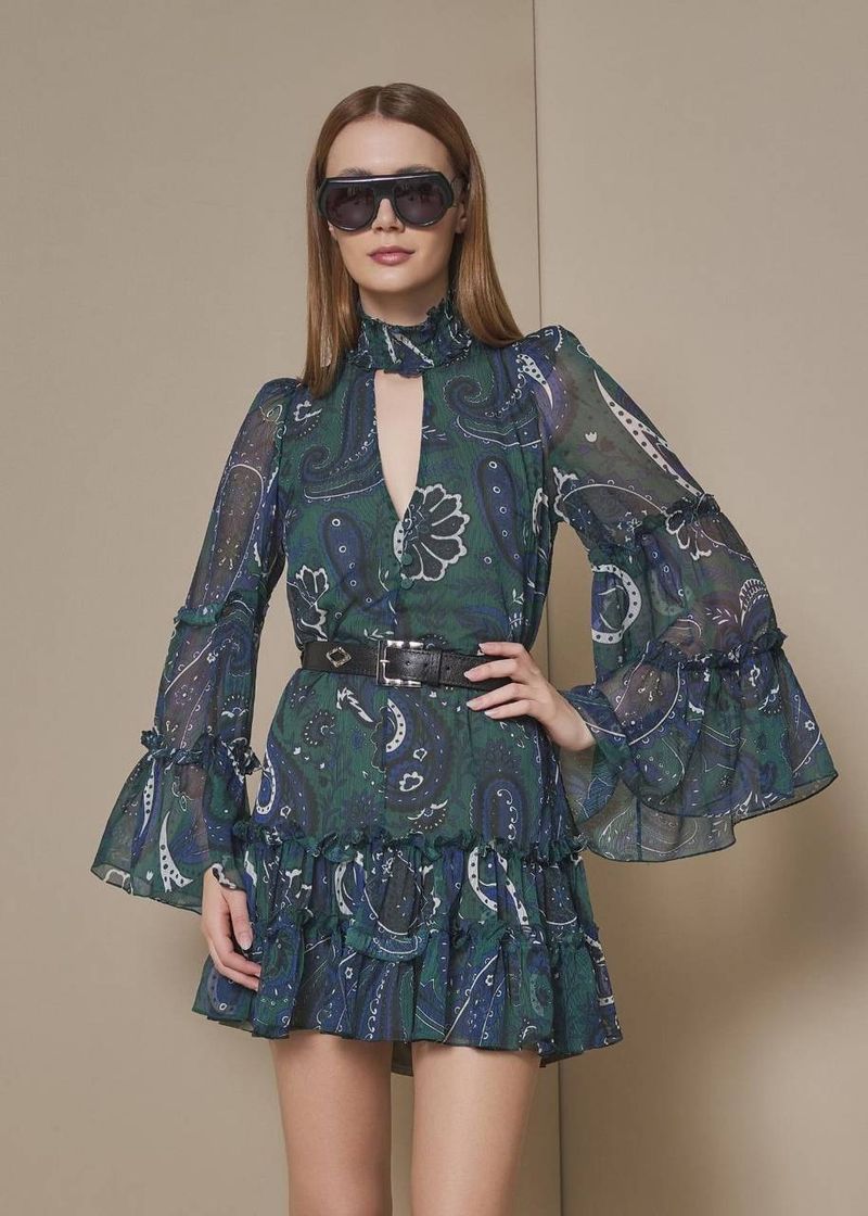 Vestido Curto De Gola Estampado - Verde