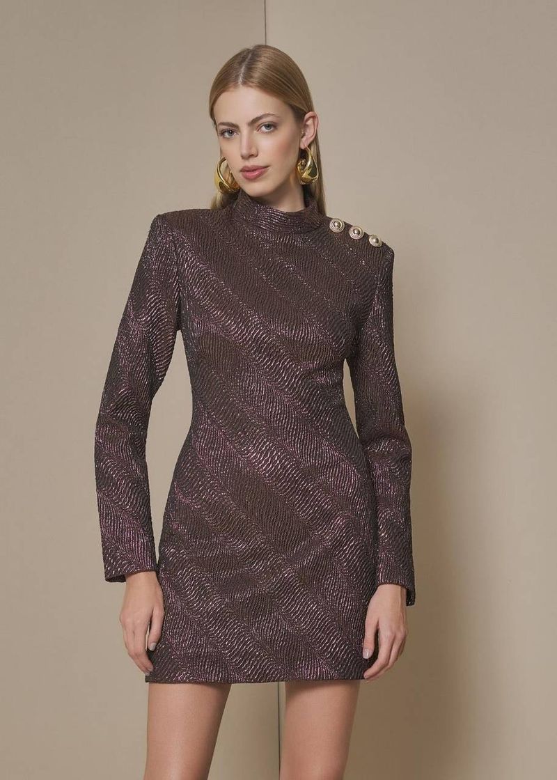 O vestido curto Choco traduz a força e a elegância da mulher contemporânea. Confeccionado em jacquard, o tecido confere estrutura e textura refinada, valorizando a silhueta com um toque de sofisticação. As ombreiras acrescentam imponência e equilíbrio ao design, enquanto os botões de metal no ombro trazem um charme moderno e autoral. Com acabamento impecável e zíper invisível nas costas, esta peça é a escolha perfeita para quem busca um look marcante, elegante e repleto de atitude.