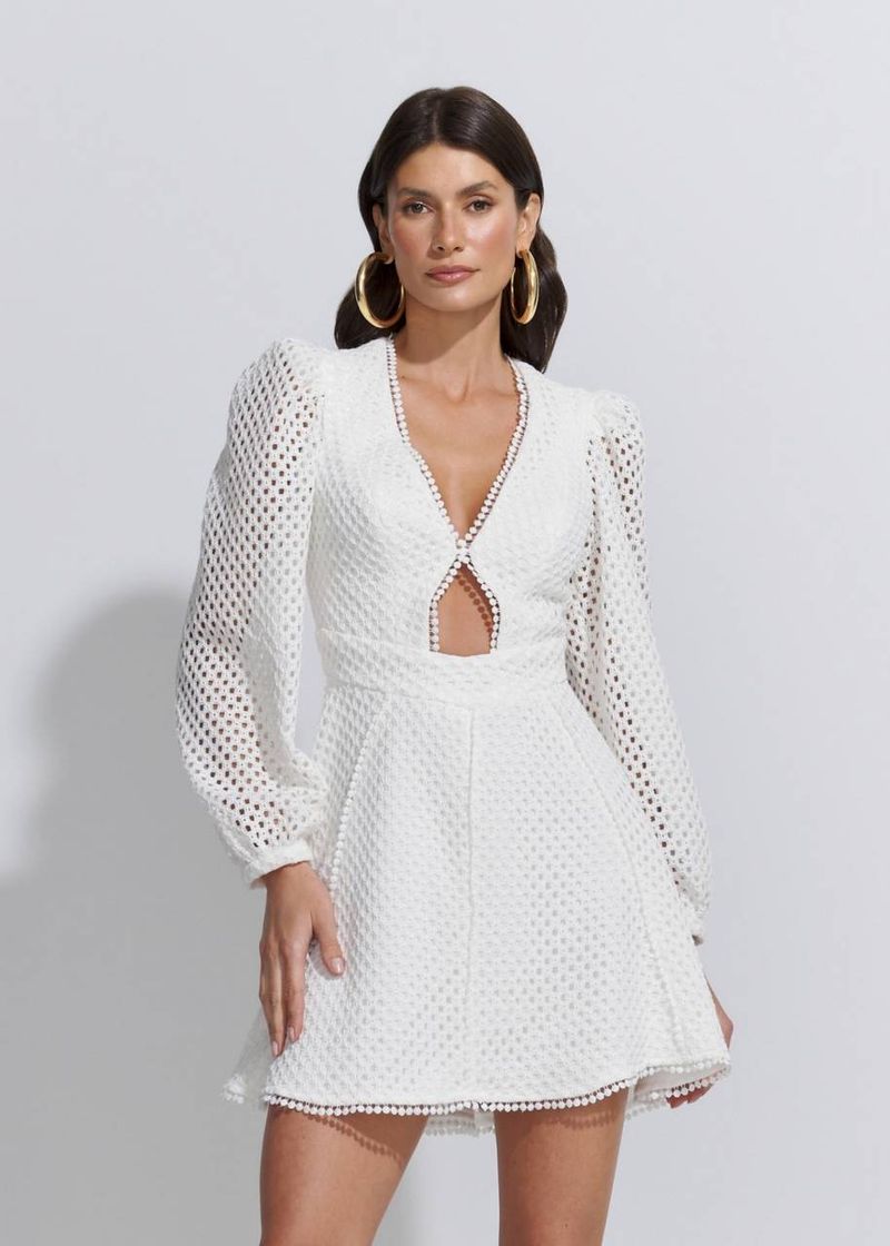 Romântico e atemporal, o vestido curto off-white em renda é ideal para ocasiões especiais durante o dia ou para compor looks fresh e elegantes. O decote em V valoriza o colo com leve sensualidade, enquanto a saia rodada e as mangas longas equilibram o visual com delicadeza. Os detalhes em aviamento e o zíper invisível nas costas garantem acabamento refinado. Use com sandália nude ou off e acessórios dourados para um visual impecável.